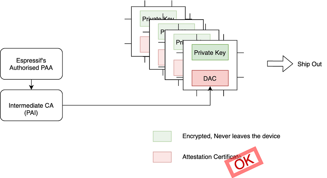 Espressif는 귀하의 기기에 대한 DAC를 생성할 수 있는 공인 PAA입니다. 귀하에게 배송되기 전에 귀하의 기기에 대해 생성된 DAC로 Espressif 측에서 안전하게 사전 프로비저닝된 모듈을 요청할 수 있습니다. DAC의 개인 키가 모듈에서 절대 나가지 않도록 주의하고, 모듈은 배송되기 전에 안전하게 잠깁니다.