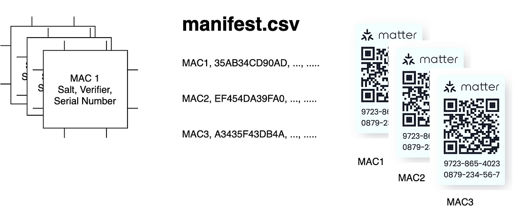 매트 제조에는 각 장치에 프로그래밍할 몇 가지 고유한 객체가 필요합니다. 여기에는 앞서 설명한 DAC가 포함됩니다. 모든 Matter 장치에는 커미션을 허용하는 고유한 QR 코드도 필요합니다. 이 QR 코드에 해당하는 고유한 비밀도 각 장치에 프로그래밍해야 앱이 장치를 안전하게 커미션할 수 있습니다.