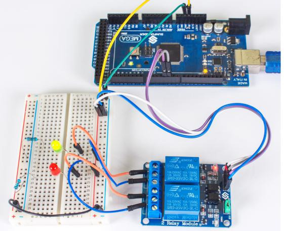 1단계: 2 채널 릴레이의 신호 단자 IN1, IN2를 SunFounder Arduino ATMega2560 보드의 디지털 포트 4, 5에 연결하고 출력 단자에 LED를 연결합니다.