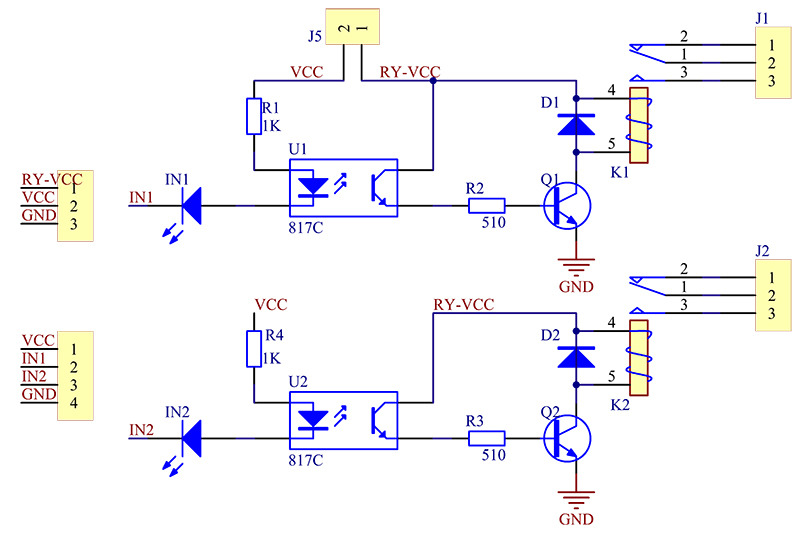 VCC 및 RY-VCC는 릴레이 모듈의 전원 공급 장치이기도합니다. 큰 전력 부하를 구동해야 하는 경우 점퍼 캡을 떼어내고 RY-VCC에 추가 전원을 연결하여 릴레이에 전원을 공급하고, VCC를 MCU 보드의 5V에 연결하여 입력 신호를 공급할 수 있습니다.