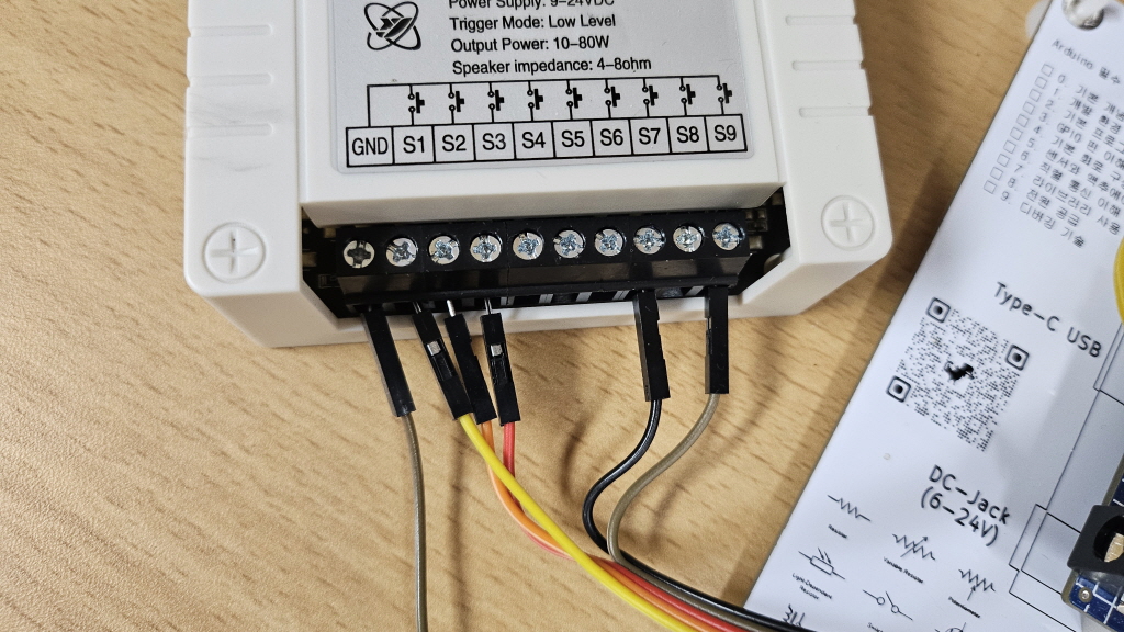 모듈에 있는 SD 카드를 빼서 적당한 음악 방송에 사용할 MP4 혹은 MP3 음악을 00001~00009까지 복사해 넣는다. 이것을 모듈에 삽입하고 연결도는 아래 이미지를 참고해 연결한다. 코드는 이미지 아래에 있다.