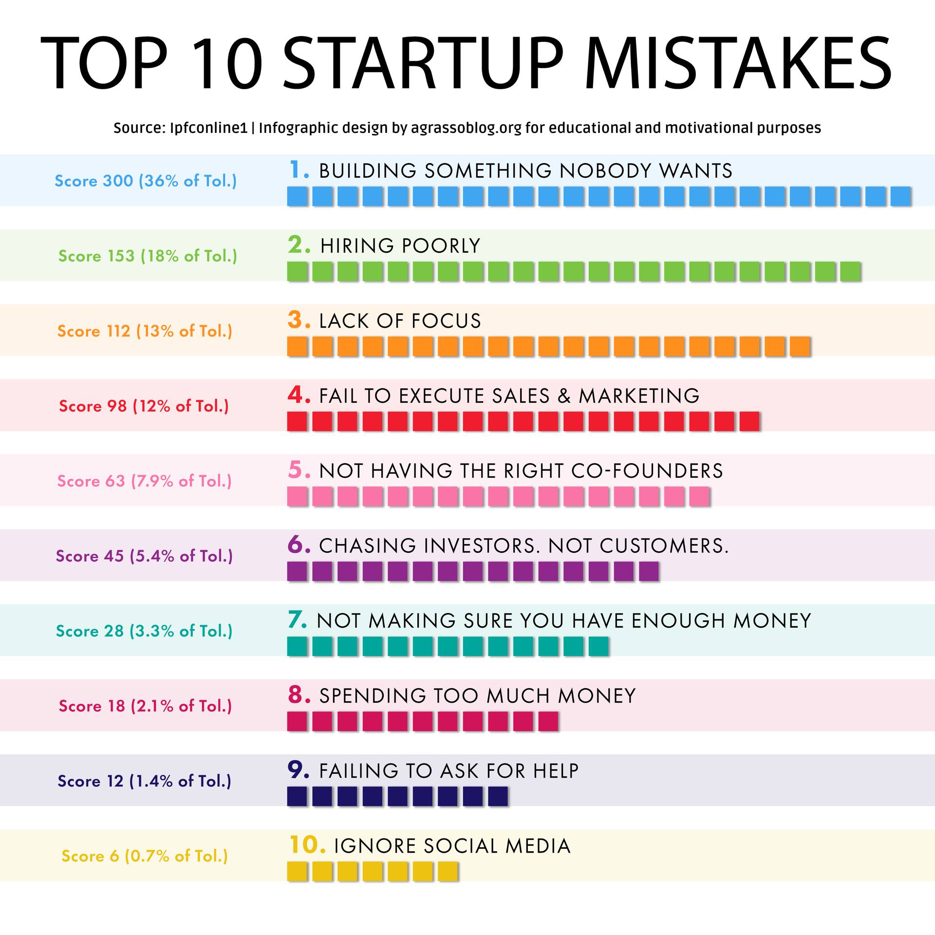일반적인 실수로는 실제 문제를 해결하지 못하는 제품을 만들고, 잘못된 사람을 고용하고, 주요 목표에 집중하지 못하는 것 등이 있습니다.