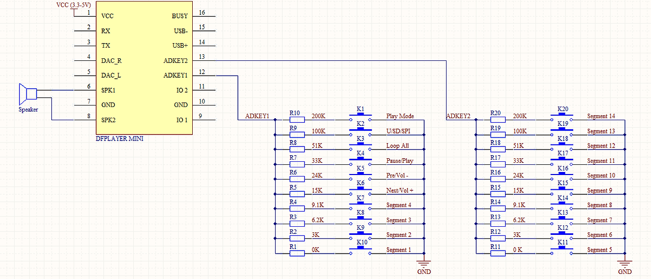 우리는 매트릭스 키보드 연결의 전통적인 방법 대신 AD 모듈 키를 사용하여 점점 더 강력한 MCU AD 기능을 활용하는 것입니다, 우리의 모듈 기본 구성 2 AD 포트, 20 키 저항 분배.