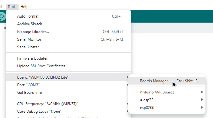 도구 메뉴를 통해 보드 관리자를 엽니다. 아래 스크린샷에서 "WEMOS LOLIN32 Lite" 보드를 선택한 것을 볼 수 있습니다. 거기에 다른 보드가 표시되지만 괜찮습니다. 보이는 보드를 선택하고 "보드 관리자..."를 클릭하기만 하면 됩니다.