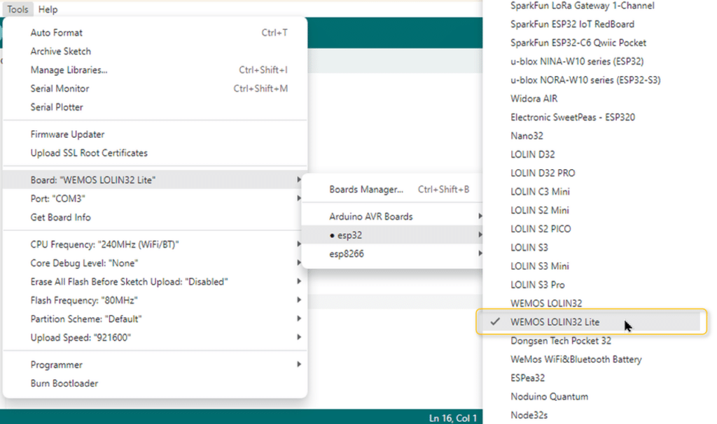 목록에서 보드를 찾으세요. 이 예에서는 WEMOS LOLIN32 Lite 보드를 사용하므로 이를 선택합니다. 그러나 다음 프로그래밍 예에서는 거의 모든 다른 ESP32 보드가 작동합니다. 실제로 컴퓨터에 연결한 보드를 선택했는지 확인하세요.