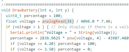 ESP32-e-Paper-Wather-Display 라이브러리의 analogRead(35) 문 전압 모니터는 배터리 단자에 연결된 간단한 전압 분배기가 될 수 있습니다.