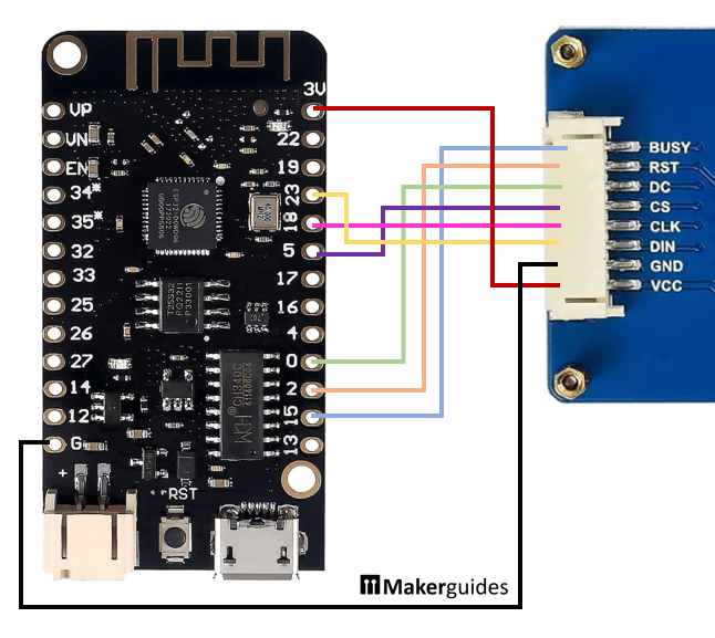 멋진 기능을 시도하기 전에 전자 종이의 기능을 연결하고 테스트해 보겠습니다. 다음 그림은 전원 및 SPI의 전체 배선을 보여줍니다.