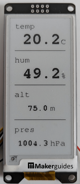 지역 기상 관측소용 코드 다음 코드는 5분마다 BME280에서 주변 온도, 습도 및 기압을 읽고 해당 정보와 함께 고도를 전자 종이 디스플레이에 표시합니다. 출력은 다음과 같습니다: