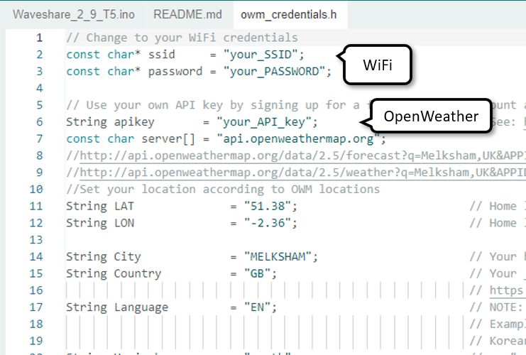 마지막으로, Arduino IDE에서 .ino 파일(예: Waveshare_2_9.ino)을 열고 owm_credential.h 파일 탭을 클릭합니다. 이 파일에는 위치, 단위, 언어, 시간대 등과 같은 기상 관측소에 대한 모든 특정 설정이 포함되어 있습니다. 가장 중요한 것은 Wi-Fi 자격 증명에 대한 상수(ssid, 비밀번호)와 여기에 설정해야 하는 OpenWeather 아피키가 있다는 것입니다.