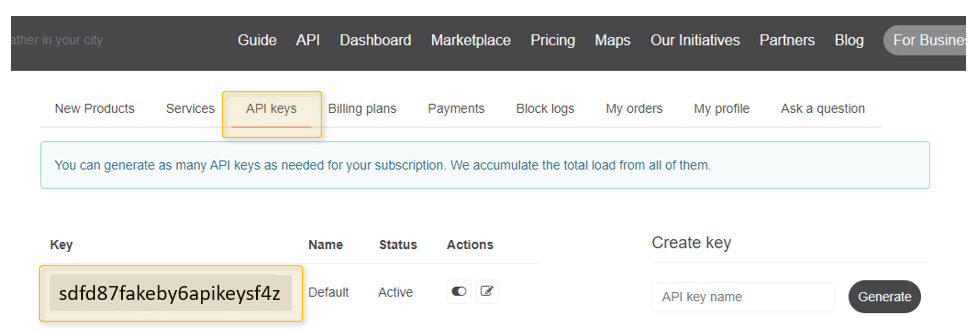 그런 다음 API 키 생성 페이지로 이동하여 API 키를 생성합니다. API 키는 아래 스크린샷에서 볼 수 있는 긴 문자열 "sdfd87fakeby6apikeysf4z"입니다. 회원님의 키는 제 키와 다르게 보일 것입니다.