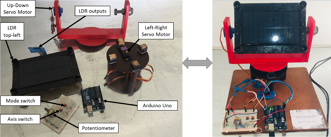 그림 6은 분리 및 조립 상태의 태양 추적기를 보여줍니다. 제시된 대로 전체 구조는 나무 판을 사용하여 제조되었으며, 언급된 모든 구성 요소가 수동 및 자동 모드(LDR 센서, Arduino Uno, 서보 모터, 전위차계, 푸시 버튼 및 소형 PV 패널)로 태양 추적기를 만드는 데 사용되었다는 것이 분명합니다.