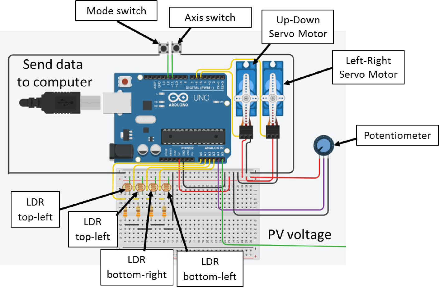 그림 3은 제안된 테스트벤치의 전자 회로를 보여줍니다. 자동 모드의 경우, 마이크로컨트롤러는 LDR센서(핀 A0~A3)의 아날로그 값을 디지털로 변환합니다. 그런 다음 두 개의 펄스 폭 변조(PWM) 신호(핀 5 및 6)를 사용하여 두 개의 서보모터(상하 및 좌우)를 제어하여 태양을 추적합니다. 회전 운동은 두 축에서 발생하는데, 방위각은 매일 태양의 경로에 따라 동쪽에서 서쪽으로, 고도는 계절별 태양의 경로에 따라 남쪽에서 북쪽으로 발생합니다. 수동 모드의 경우, 전위차계(핀 A4)를 사용하여 두 서보 모터의 움직임을 제어하고, 푸시 버튼(핀 11)을 배치하여 전위차계를 상하 서보모터 또는 좌우 서보모터에 연결합니다. 또한, 또 다른 푸시 버튼(핀 12)을 사용하여 두 모드 사이를 전환합니다. 또한 PV 전압은 Arduino의 아날로그 핀 A5를 통해 측정한 다음 부하의 저항이 이미 알려져 있으므로 PV 전류를 계산합니다. 다음으로 PV 전류, 전압 및 전력 대 시간 및 실제 모드를 컴퓨터로 전송하여 MS Excel에서 실시간으로 표시합니다.