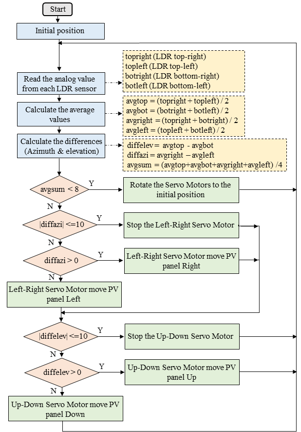 3. 자동 모드가 활성화된 경우 그림 4에 제시된 알고리즘이 실행됩니다. 후자는 LDR 센서에서 반환된 아날로그 값을 사용합니다. 예를 들어 방위각 또는 수직 축을 고려할 때 두 개의 오른쪽 LDR과 두 개의 왼쪽 LDR의 평균 값을 비교하고 왼쪽 LDR 세트가 더 많은 빛을 받으면 태양 추적기가 좌우 서보 모터를 통해 해당 방향으로 이동합니다. 후자는 차이 결과가 [-10, 10] 범위에 있을 때까지 계속 회전합니다. 이 범위는 컨트롤러를 안정화하는 데 사용되며 태양 추적기가 태양과 수직이 되면 더 이상 제어가 이루어지지 않습니다. 반면, 오른쪽 LDR 세트가 더 많은 빛을 받으면 태양 추적기가 좌우 서보 모터를 통해 해당 방향으로 이동하고 차이 결과가 [-10, 10] 범위에 있을 때까지 계속 회전합니다. 고도 축에도 동일한 방식이 사용됩니다. 게다가, 우리는 또한 4개의 LDR 센서 사이의 평균 복사량을 결정했고 이 값이 작은 값(8: 조정되고 실제적으로 테스트되었으며 복사가 null일 때 반환되는 값)보다 작은지 여부를 결정했습니다. 즉, 밤이 왔습니다. 이 경우 태양 추적기는 태양의 뜨는 위치로 돌아가야 합니다. 예를 들어, 좌우 서보 모터에서 0도, 상하 서보 모터에서 30도를 설정하여 태양의 뜨는 위치에 도달할 수 있는 경우입니다. 이는 Arduino IDE에서 제공하는 C 함수 "servox.write(angle)"을 통해 쉽게 수행할 수 있습니다.