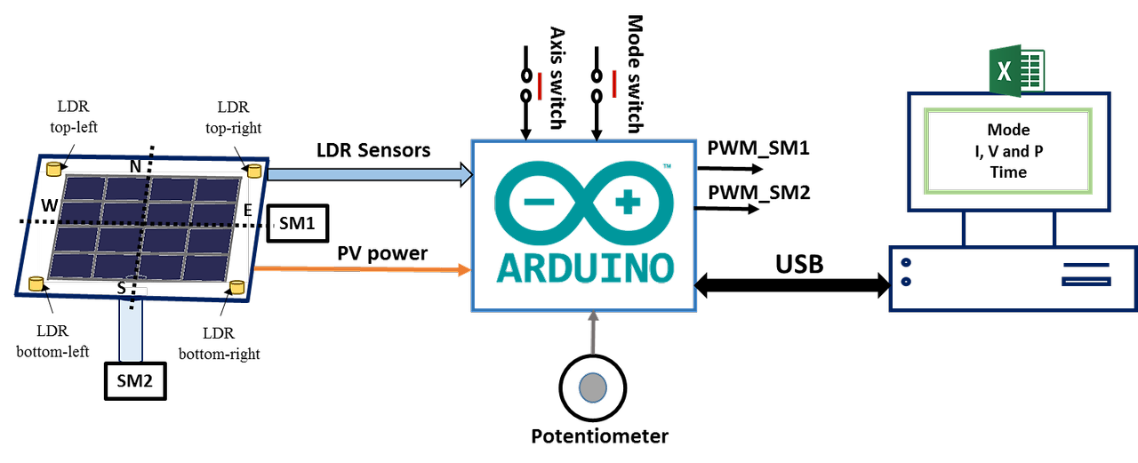 제안된 테스트 벤치는 그림 1에 나와 있습니다. 4개의 LDR 센서와 2개의 서보모터(SM1 및 SM2)의 도움으로 태양을 추적하기 위해 자동으로 회전할 수 있는 태양 추적기를 기반으로 하거나 전위차계를 사용하여 수동으로 회전할 수 있습니다. 두 모드(자동 및 수동) 간에 전환하려면 푸시 버튼을 사용합니다. 또 다른 푸시 버튼은 SM1(상하 서보모터) 또는 SM2(좌우 서보모터)를 전위차계에 연결하여 움직임을 제어하는 데 사용됩니다. 또한 컴퓨터는 MS Excel에서 시간에 따른 PV 패널의 모드와 전류, 전압 및 전력을 시각화하는 가상 계측기로 사용됩니다. Arduino Uno 보드는 시스템의 모든 소프트웨어 요구 사항을 구현하는 데 사용됩니다.