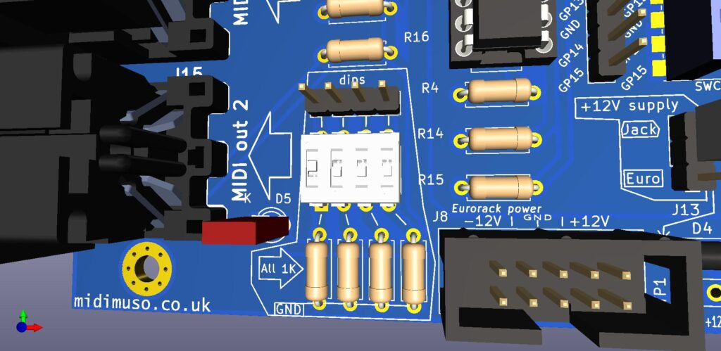 4개의 온보드 커밋되지 않은 DIP 스위치는 (예: MIDI 채널 선택, 모드 스위치로 사용) 등을 위한 것입니다. 각각은 1K 저항으로 접지에 연결됩니다.