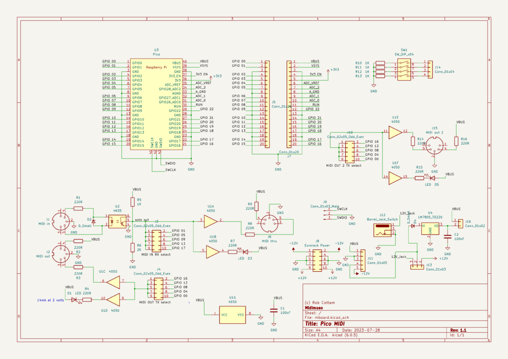 Pico의 USB 연결로 전원이 공급되는 기능입니다. 향후 프로젝트(예: 유로락)를 위해 원하지 않는 한 12V를 공급할 필요가 없습니다. MIDI 협회 표준에 따라 적절하게 광 절연된 MIDI 입력.