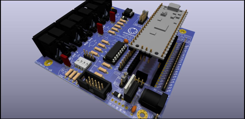 라즈베리파이 Pico 마이크로컨트롤러 보드용 드롭인 확장 키트입니다. 미디 프로젝트에 Pico의 UART 2개를 사용할 수 있습니다. 듀폰 케이블을 사용하여 Pico의 GPIO 핀 중 하나를 사용할 수도 있습니다.