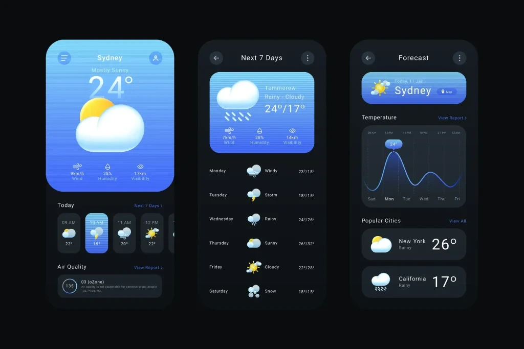 사용자는 앱을 사용하여 현재 날씨를 확인하고 이해하기 쉬운 형식으로 모든 위치에 대한 예보를 볼 수 있습니다. 도시 이름이나 위치만 입력하면 앱에서 몇 초 이내에 필요한 정보를 검색합니다. 버튼을 클릭하여 값을 섭씨에서 화씨로 변환할 수도 있습니다.
