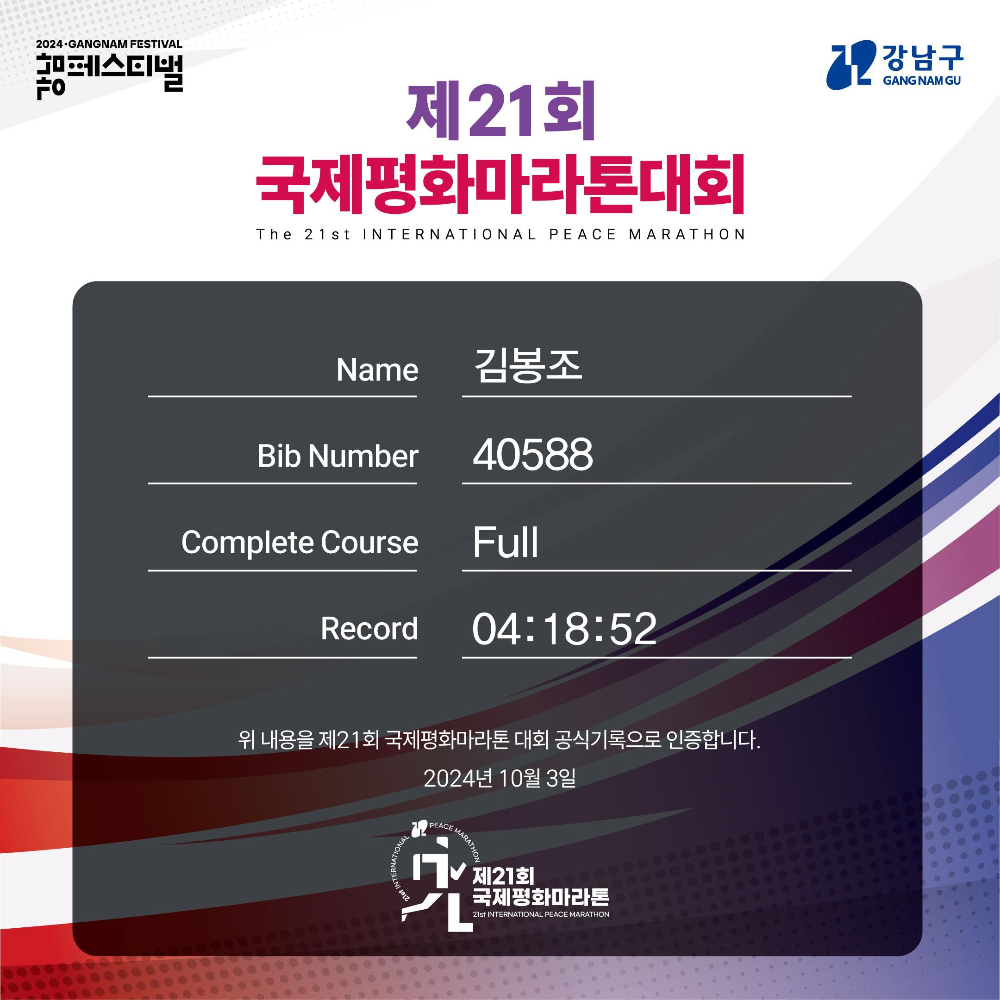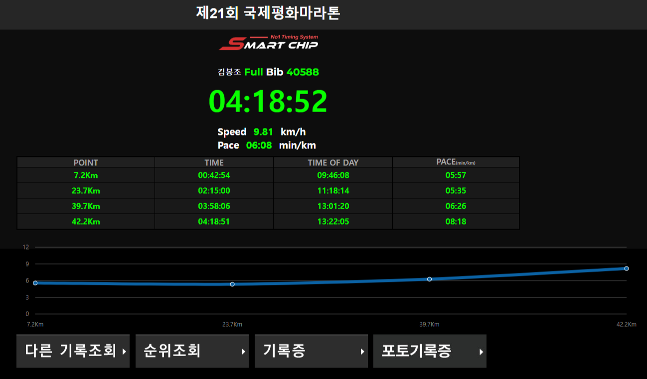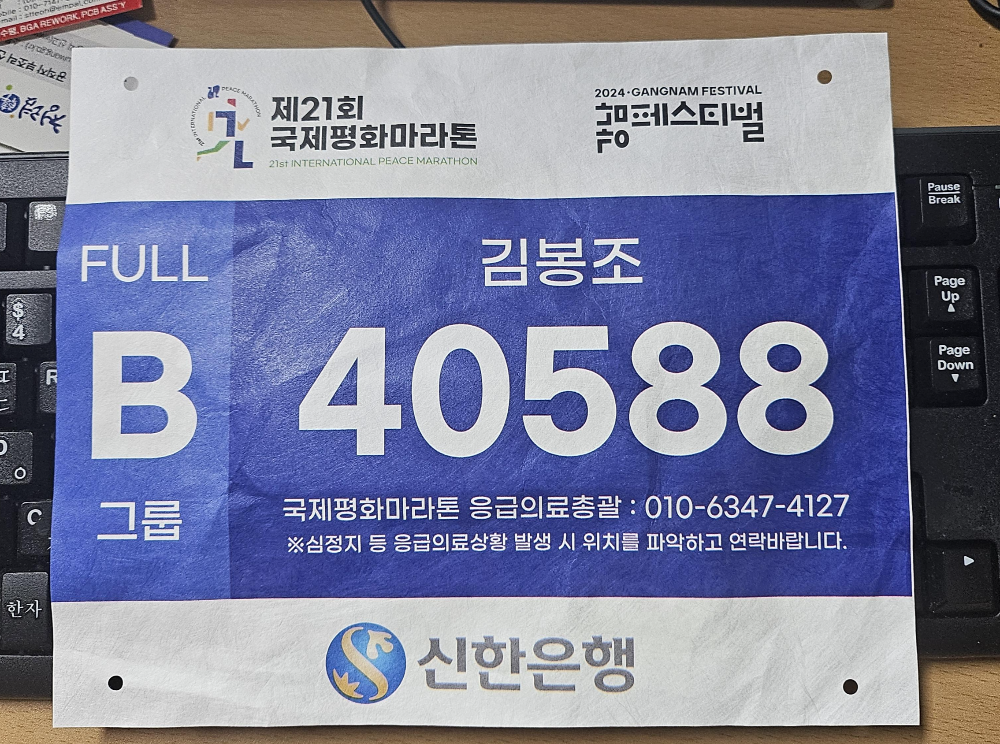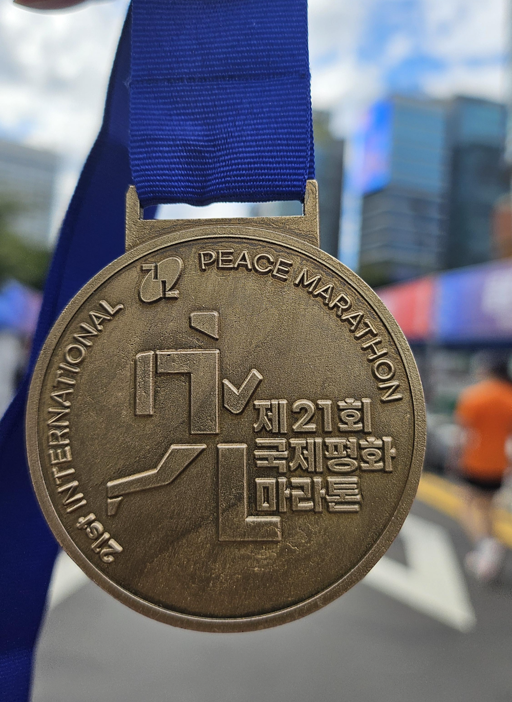 10월 3일 개천절에 열린 21회 국제 평화 마라톤 대회 풀코스 42.195km를 완주했다. 이번 풀코스 완주를 엄두도 못 낸 이유에는 한 달 전 부상이 있어서 훈련을 못한 이유가 있다. 하지만 무엇이든 단계를 밟아 올라간다는 일은 거의 표준이다. 9월 19일 훈련에서 하프 21km를 달리는 데 15km부터 걷고 달리고를 했지만 끝냈다. 3일 후에 22일 열린 공주 백제 마라톤에서 32km를 달리는 데 25km 지점부터 다시 걷고 달리며 완주했다. 이 정도면 예상을 한다. 이번 국제 평화 대회에선 35km 지점부터 좀 힘들겠구나. 하고 말이다.