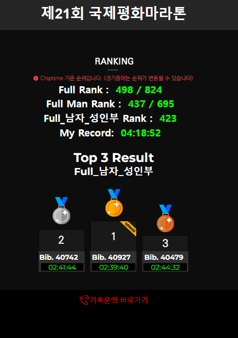 순위 조회다. 전체 824명이 풀코스를 달려 498등이다. 남자 러너 695명 중 437등이다. 나이 구간에 따른 순위는 나오지 않았지만 아주 멋진 기록이다.