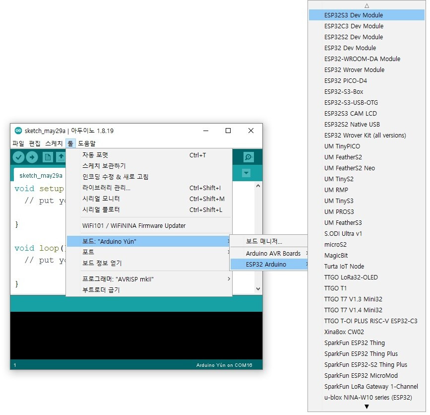 툴 -> 보드-> 보드 매니저 를 선택합니다