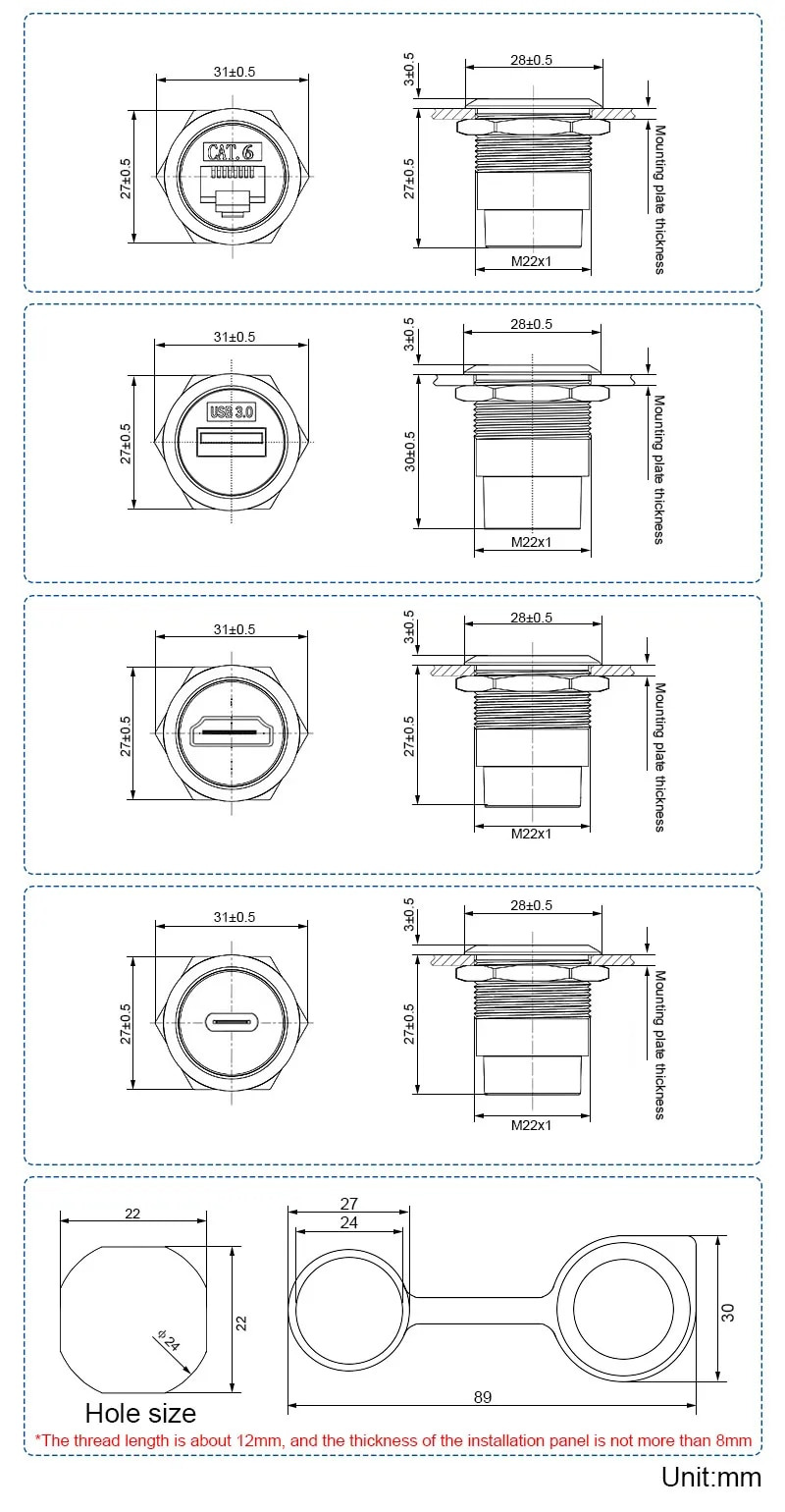 - 패널 등에 장착하여 사용할 수 있는 커넥터로 22mm 홀에 장착하여 사용이 가능합니다.