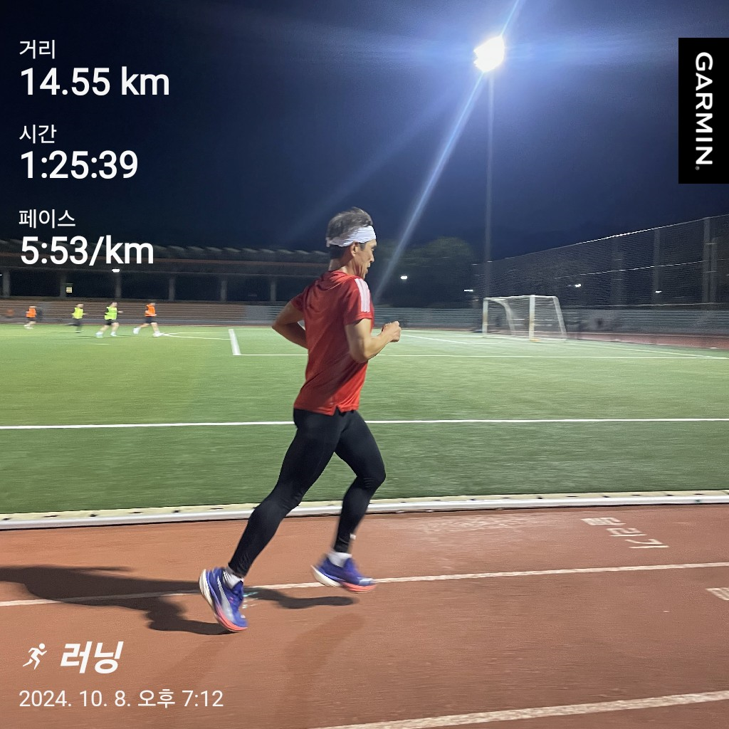 10월 8일 화요일 훈련. 관문체육공원, 거리 14.55km, 1시간 25분 39초, pace 5:53초