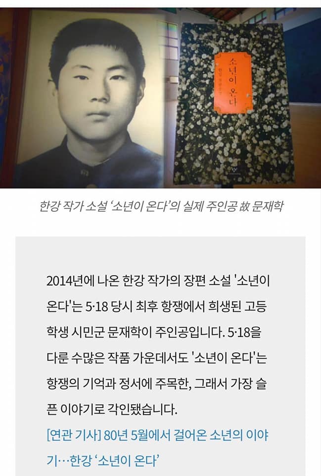 1980년 5월 27일 새벽 4시에서 5시반 경에 전남도청 구내 전라남도 경찰국 본관 2층 복도 중앙 로비에서 15살의 소년이 4-5발의 총상을 입고 죽었다. 이 소년은 교련복을 입고 있었으며, 죽기 직전에 무장을 했는지는 확인되지 않았으나, 당시 외신기자가 찍은 사진을 보면 시신 옆에 삼립 보름빵이 있는 것으로 봐서 죽기 전에 배가 고팠던 것 같다. 이 소년의 이름은 문재학이고 광주항쟁 마지막 날에 도청을 지키다 죽은 18명 중 한 사람이다. 당시 이 소년은 광주상고 1학년생이었다. 이 문재학 군이 이번에 노벨 문학상을 수상한 한강 작가의 작품 “소년이 온다“(영어 제목 Human acts)의 실제 모델이다.