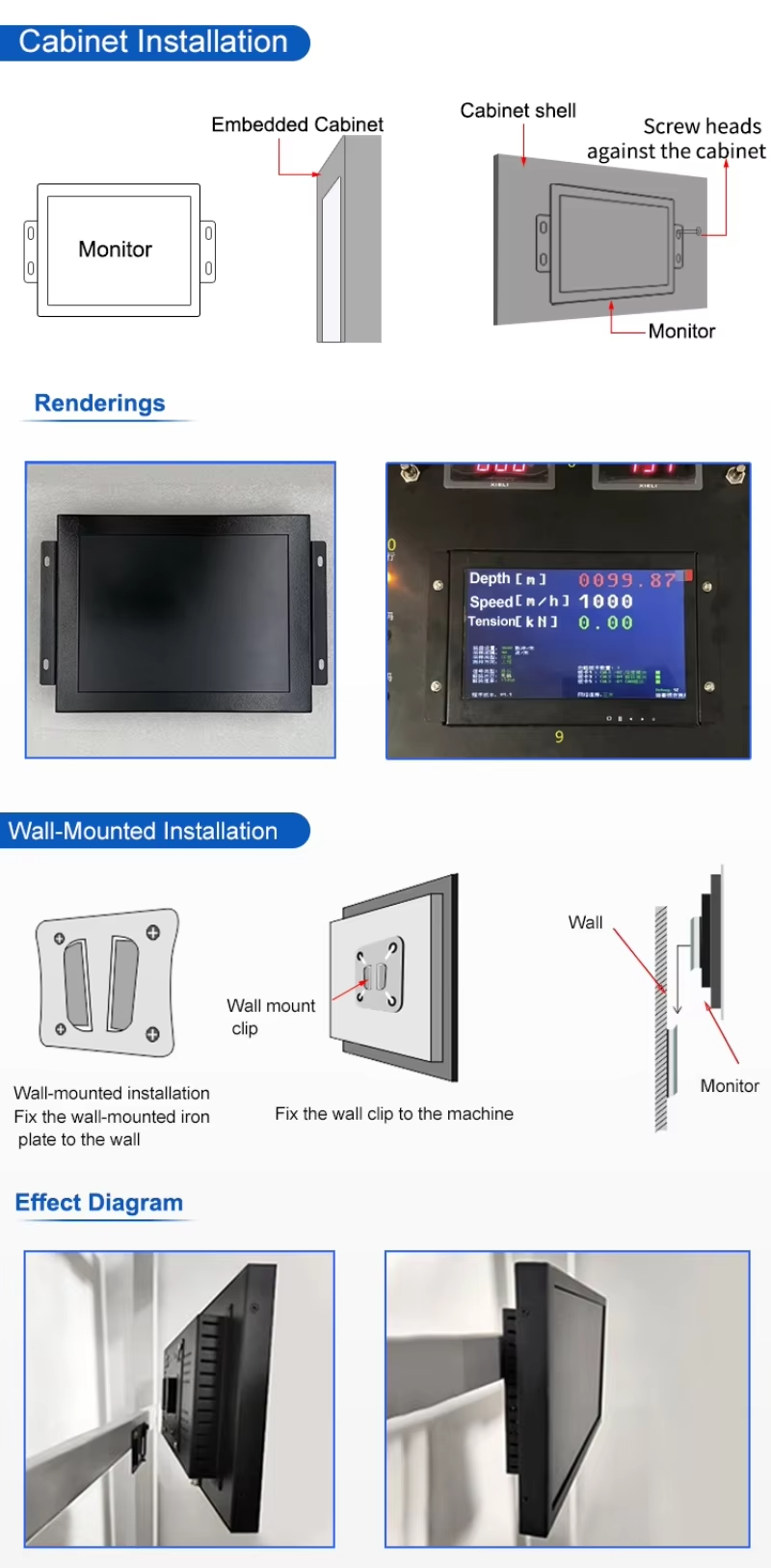 | 장점 | 냉간 압연 판금 재료, 강한 케이싱, 충격 방지, 간섭 방지; 전원 켜기 부팅 기능, 타이밍 부팅 기능; 벽걸이 형, 데스크탑, 임베디드 설치 지원; 산업용 고휘도 디스플레이 사용, 더 긴 수명; 산업 디자인 자연 열 방출; 터치 스크린, 안정적인 성능, 드리프트가없는 정확한 위치, 높은 감도. |