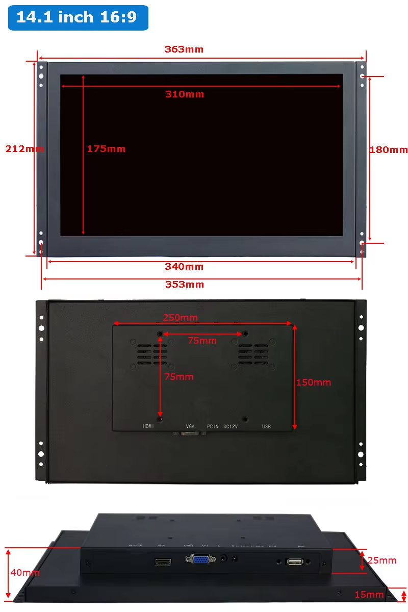 Zhixianda 14.1 인치 1920*1080 오픈 프레임 모니터 터치 기능 없음 VGA HDMI USB 인터페이스 장비용 산업용 디스플레이