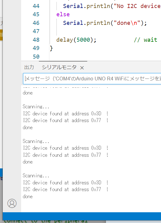 기존에 많이 사용되는 i2cScanner.ino를 실행하여 슬레이브 주소를 확인합니다.이 마이컴 보드에는 Qwiic 전용 커넥터가 준비되어 있지만 BME280은 인식하지 못했습니다.