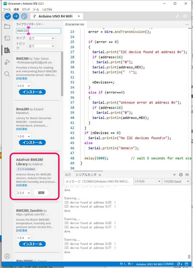 BME280으로 검색하여 찾은 Adafruit BME280 라이브러리를 설치합니다.