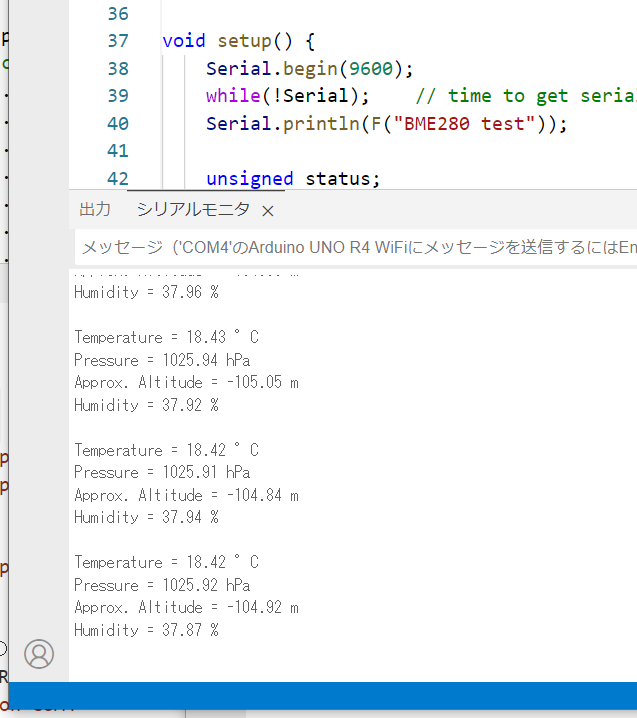 Adafruit에서 구입한 MEMS 기압 센서 BME280(보쉬)을 사용합니다.기압과 온도, 습도를 측정할 수 있습니다.마이크로컴퓨터 보드 Arduino UNO R4 WiFi는 Wi-Fi와 BLE 무선 통신을 지원하며, BLE로 3회에 걸쳐 송수신합니다.