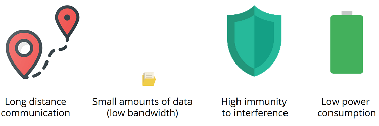 이 변조 기술은 소량의 데이터(즉, 대역폭이 낮음)의 장거리 통신과 간섭에 대한 높은 면역성을 허용하면서 전력 소비를 최소화합니다. 따라서 전력 요구 사항이 낮은 장거리 통신이 가능합니다.
