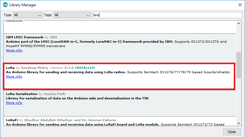 Arduino IDE를 열고 Sketch > Include Library > Manage Libraries로 이동하여 "LoRa"를 검색합니다. 아래 그림에서 강조 표시된 LoRa 라이브러리를 선택하여 설치합니다.