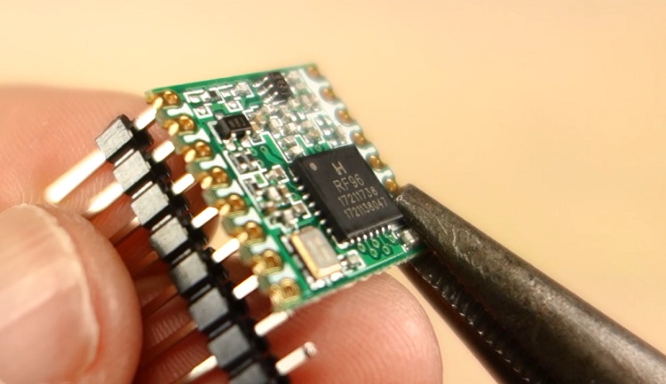 RFM95 트랜시버는 브레드보드에 적합하지 않습니다. 2.54mm 헤더 핀의 일반적인 행은 트랜시버 핀에 맞지 않습니다. 연결 사이의 간격이 평소보다 짧습니다.