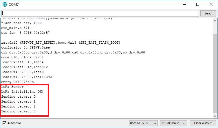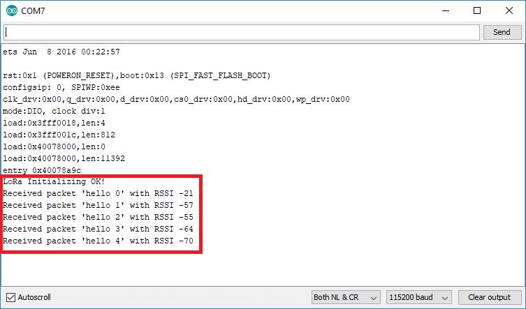 LoRa 수신기의 직렬 모니터를 열고 LoRa 송신기 활성화 버튼을 누릅니다. 수신기에서 LoRa 패킷을 받기 시작해야 합니다.