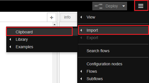 그런 다음 Node-RED 창에서 오른쪽 상단 모서리에 있는 메뉴를 선택하고 가져오기 > 클립보드로 이동합니다.