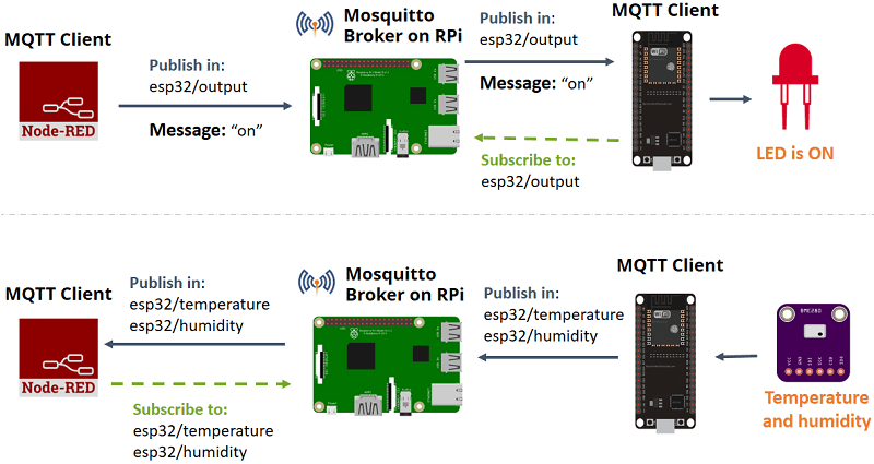 - Node-RED 애플리케이션은 토픽 esp32/output에 메시지("on" 또는 "off")를 게시합니다. ESP32는 해당 토픽에 구독되어 있습니다. 따라서 LED를 켜거나 끄기 위해 "on" 또는 "off" 메시지를 수신합니다.