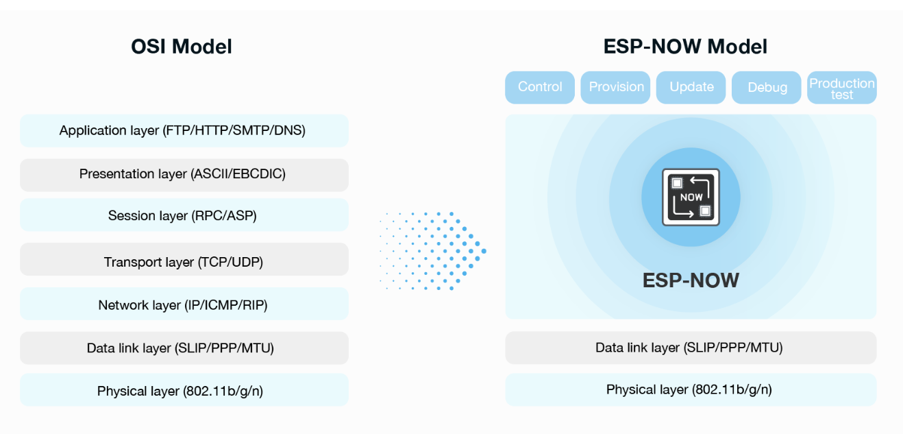 ESP-NOW는 데이터 링크 계층을 기반으로 하는 무선 통신 프로토콜로, OSI 모델의 5개 계층을 1개 계층으로 줄였습니다. 따라서 네트워크 계층, 전송 계층, 세션 계층, 프레젠테이션 계층, 애플리케이션 계층을 통해 데이터를 전송할 필요가 없습니다. 또한 각 계층에 패킷 헤더나 언패커가 필요하지 않으므로 혼잡한 네트워크에서 패킷 손실로 인한 지연을 줄여 빠른 응답이 가능합니다.