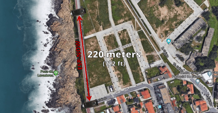 두 보드 간의 통신 범위를 테스트한 결과, 열린 들판에서 최대 220미터(약 722피트)까지 안정적인 통신이 가능했습니다. 이 실험에서는 두 ESP32 온보드 안테나가 서로를 가리키고 있었습니다.