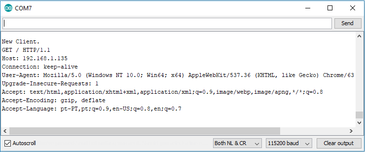직렬 모니터를 살펴보면 백그라운드에서 무슨 일이 일어나고 있는지 볼 수 있습니다. ESP는 새 클라이언트(이 경우 브라우저)로부터 HTTP 요청을 받습니다.