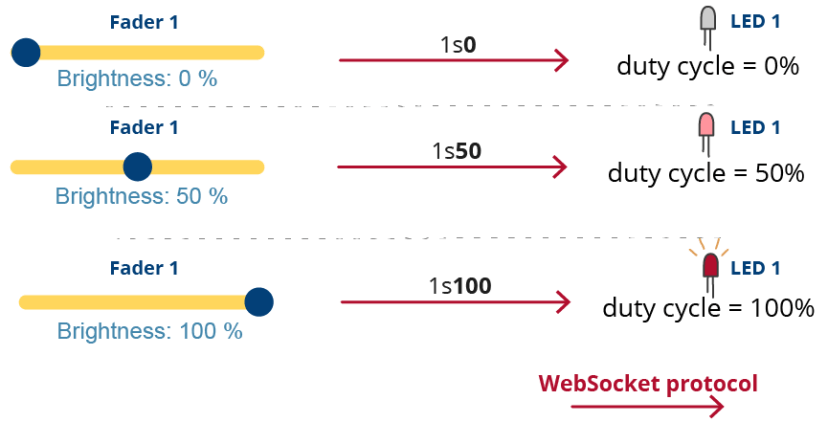 - 슬라이더에 대한 새 위치를 설정하면 클라이언트가 WebSocket 프로토콜을 통해 슬라이더 번호와 슬라이더 값을 서버로 전송합니다. 예를 들어, 슬라이더 번호 3을 위치 번호 40으로 설정하면 이 메시지 3s40을 서버로 전송합니다.