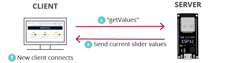 새로운 웹 브라우저 창을 열 때마다(새로운 클라이언트가 연결할 때) getValues라는 메시지와 함께 ESP32(WebSocket 프로토콜을 통해)로 메시지를 보냅니다. ESP32가 이 메시지를 받으면 현재 슬라이더 값을 보냅니다. 이렇게 하면 새 탭을 열 때마다 항상 현재 값과 업데이트된 값이 표시됩니다.